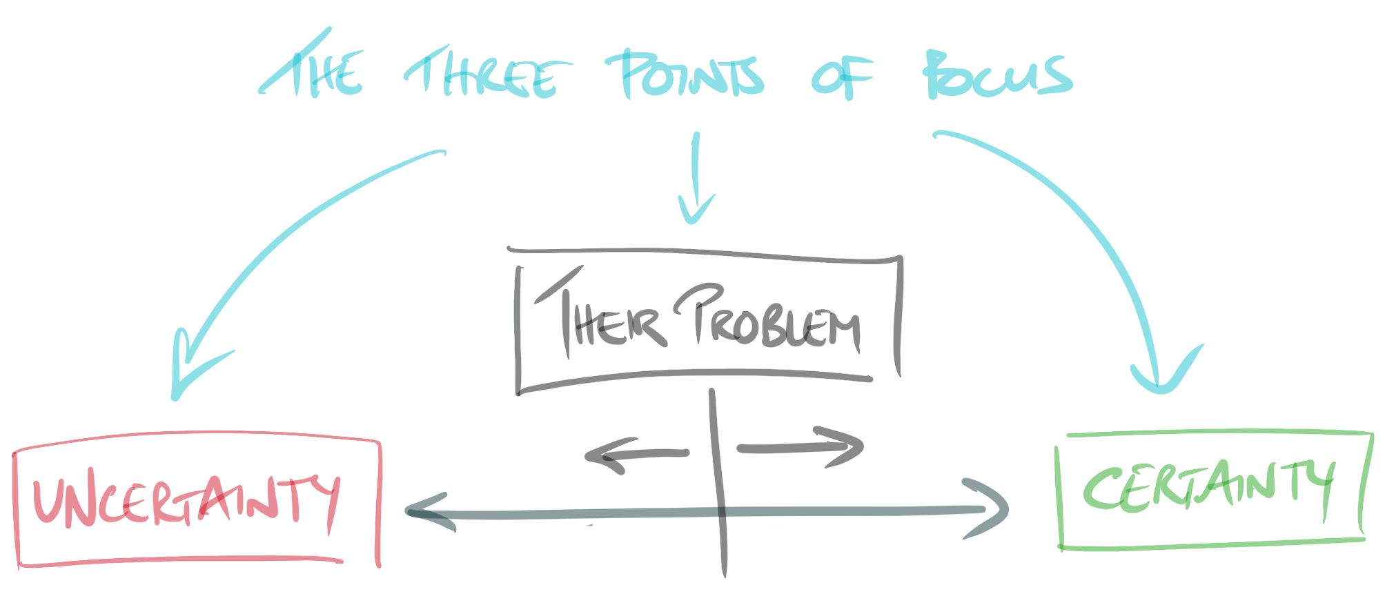 In times of uncertainty you MUST offer them safety. When their focus on trying to solve their problem or need is distracted by their fear of an uncertain world, you must offset that fear first.